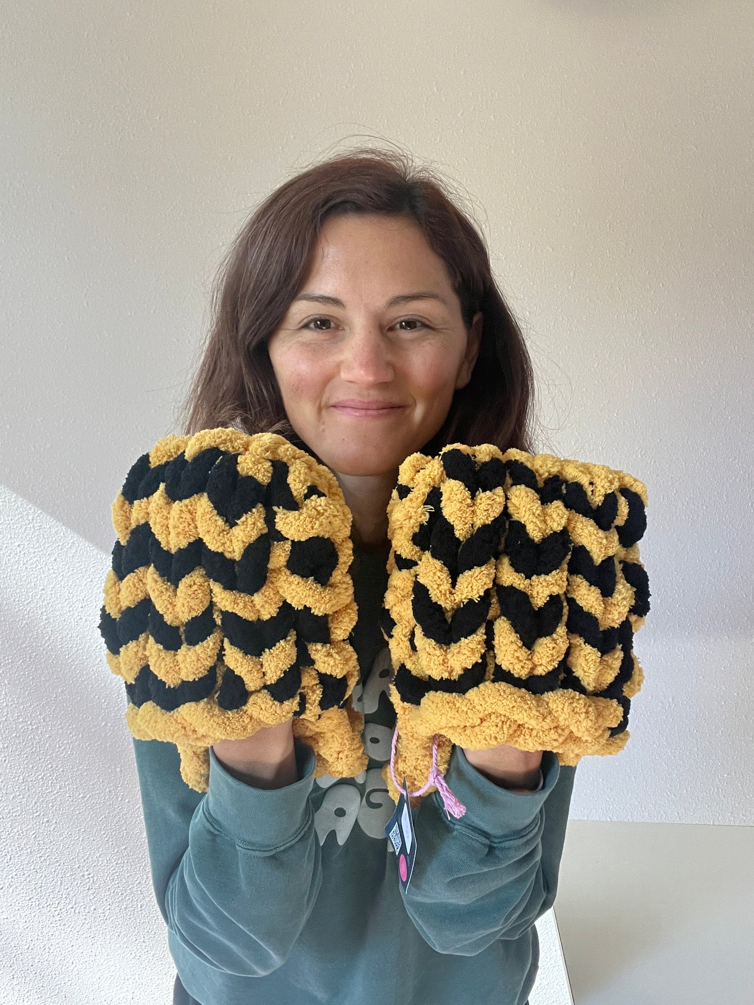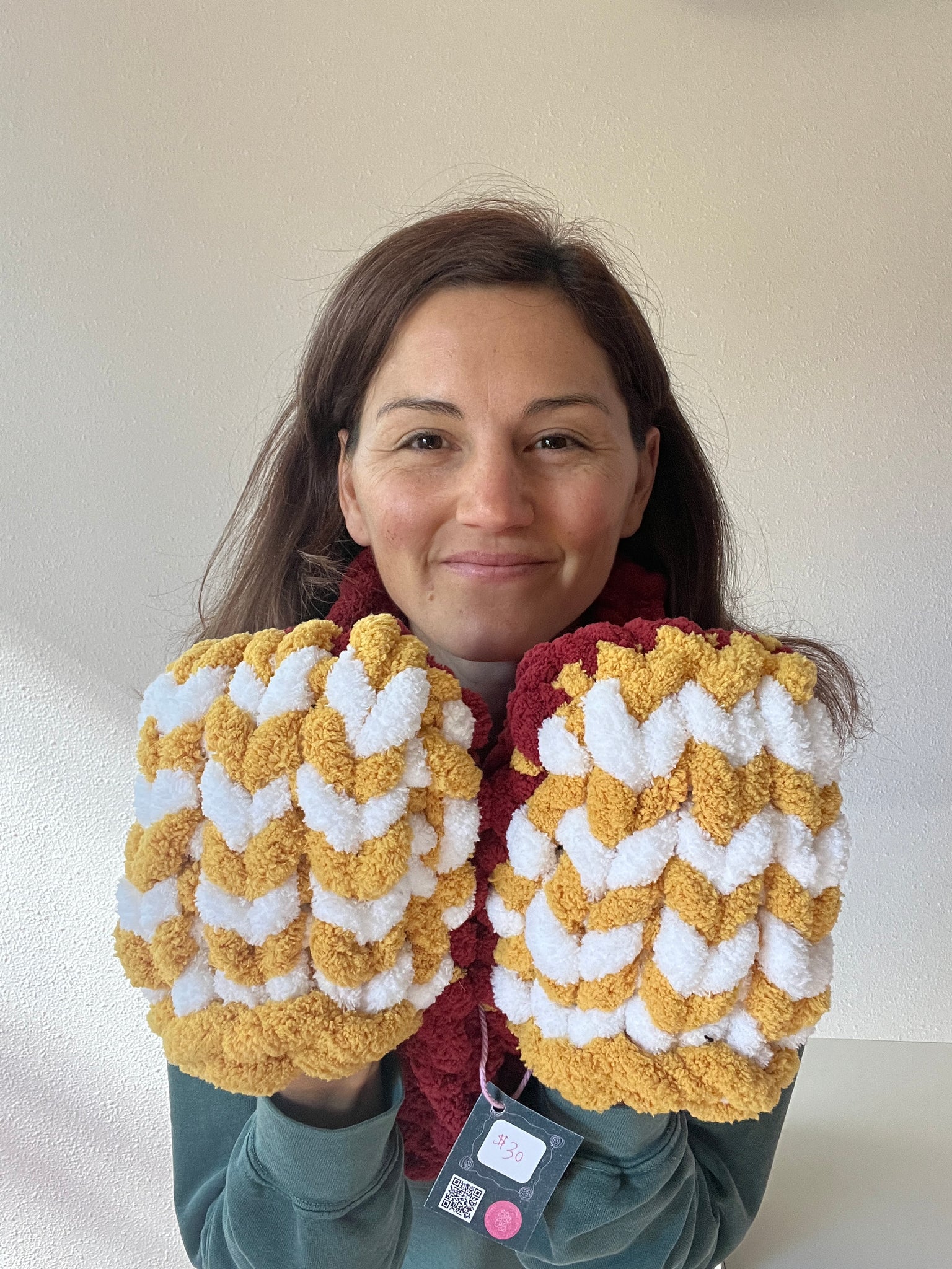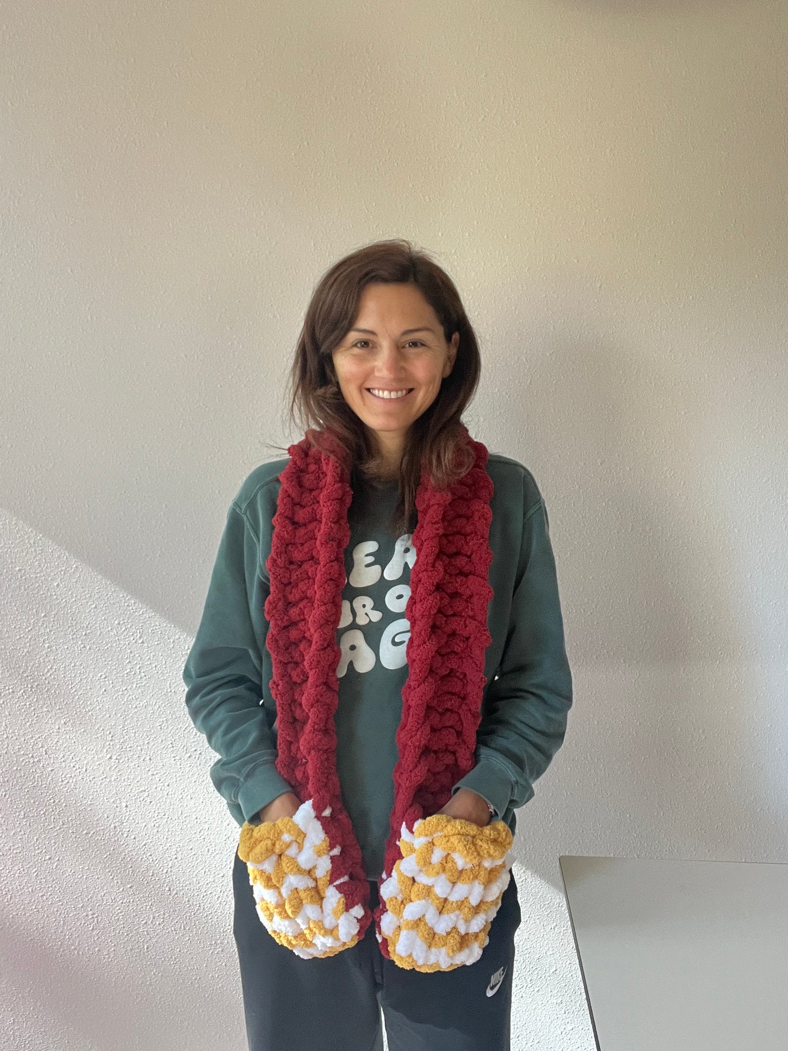 Thear scarves are extra warm and cozy with pockets on both ends for your hands, or simply to toss around your neck to keep out the cold!